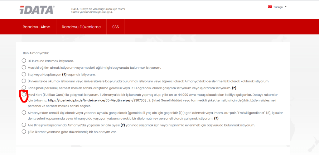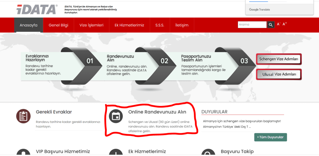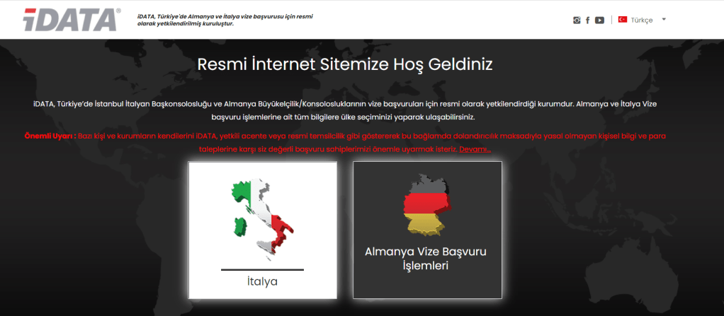 - Öncelikle, Almanya vize başvurularını kendi konsolosluğundan kabul etmiyor. Bunun için bir aracı kuruluş ile çalışıyor. Resmi olarak çalıştığı kuruluş iDATA. Bu sebeple, randevumuzu iDATA internet sitesi üzerinden alacağız