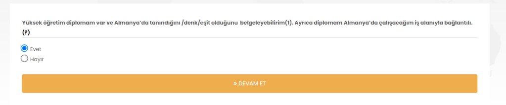 Bundan sonraki aşamada bazı soru cevaplar geliyor karşımıza, burdaki önemli sorulardan biri de “Yüksek Öğretim diplomam var ve Almanya’da denkliğini belgeleyebilirim”. Almaya’daki üniversite denkliği için bu yazımı inceleyebilirsiniz.